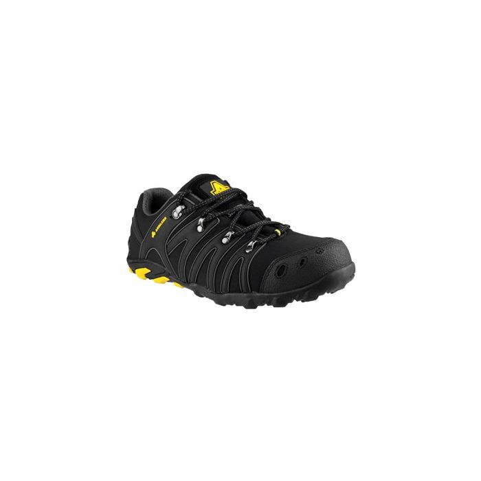 FS23 is an extra light steel toe trainer with a soft shell upper. Soft Shell is a tightly woven fabric renowned for it’s breathability, and coated with a durable water repellent (DWR) finish. This unisex trainer provides all day comfort through its padded collar and tongue plus front and rear rubber bump guards. Constructed with three robust D ring lace holds and upper speed lacing hooks.