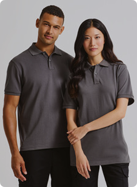 The Authentic eco polo is made from recycled polyester and cotton and is manufactured in Russell Europes own production facility.