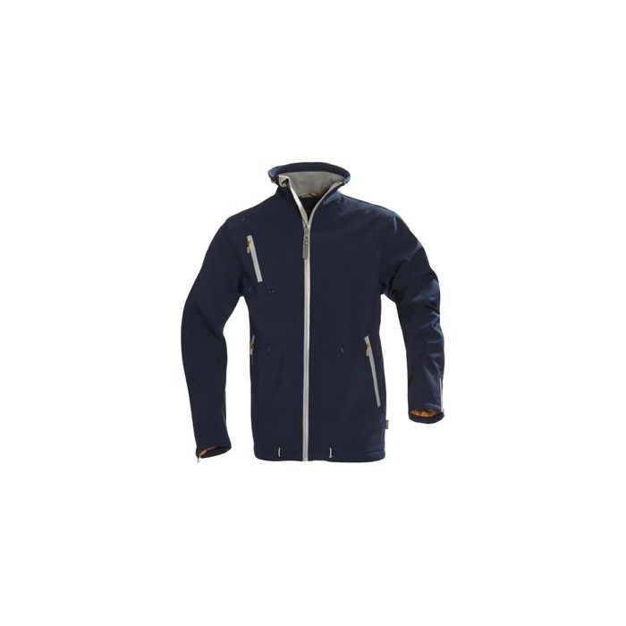 Mens fully lined soft shell jacket with water proof and breathable membrane. Elastic drawstring at bottom hem and top of collar. Fleece inside collar and front pocket bags. Two zipped inner pockets, one with cord opening. Shell 96 % polyester 4 % span