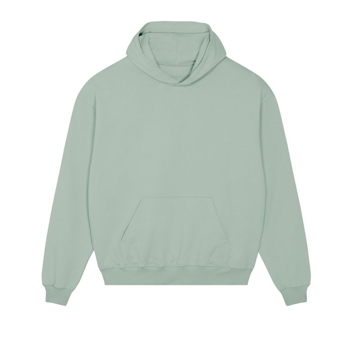 Unisex boxy dry hand-feel hoodie sweatshirt. Set-in sleeve. Double-layered hood in self-fabric. Inside single Jersey back neck tape. Self-fabric half-moon at back neck. Single needle topstitch at neckline and along hood opening. 2x1 rib at sleeve hem and bottom hem. Armhole, sleeve hem and bottom hem with twin-needle topstitch. Kangaroo pocket at front. GOTS certified. Fairwear certified. Vegan certified.
