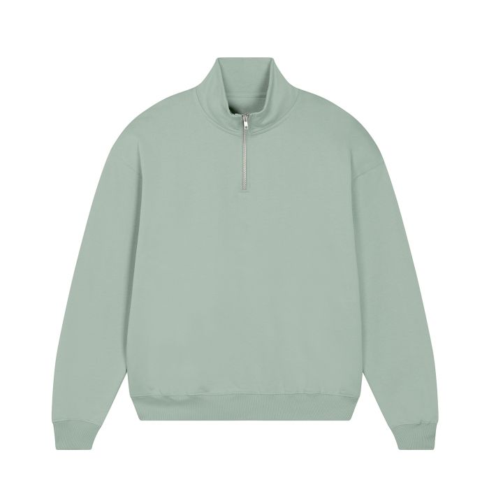 Unisex boxy dry hand feel quarter zip sweatshirt. Set-in sleeve. Neck collar in self-fabric. Herringbone tape at inside back neck and at inside of zip. Quarter zip at centre front. 2x1 rib at sleeve hem and bottom hem. Armhole, sleeve hem and bottom hem with twin-needle topstitch. GOTS certified. Fairwear certified. Vegan certified.