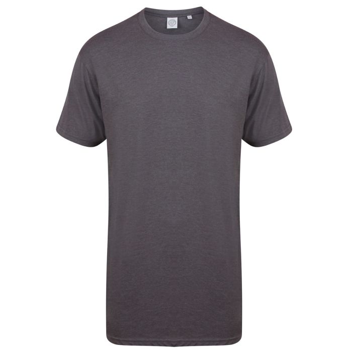 Regular fit at chest and shoulders. Extra-long length, with longer dipped hem at back. Twin-needle stitching. Stretch rib neck.
